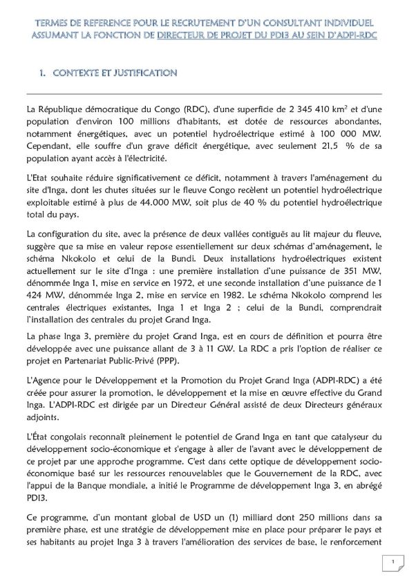 RECRUTEMENT D’UN CONSULTANT INDIVIDUEL ASSUMANT LES FONCTIONS DE DIRECTEUR DE PROJET A L’AGENCE POUR LE DEVELOPPEMENT ET LA PROMOTION DU PROJET GRAND INGA (ADPI-PDI3)