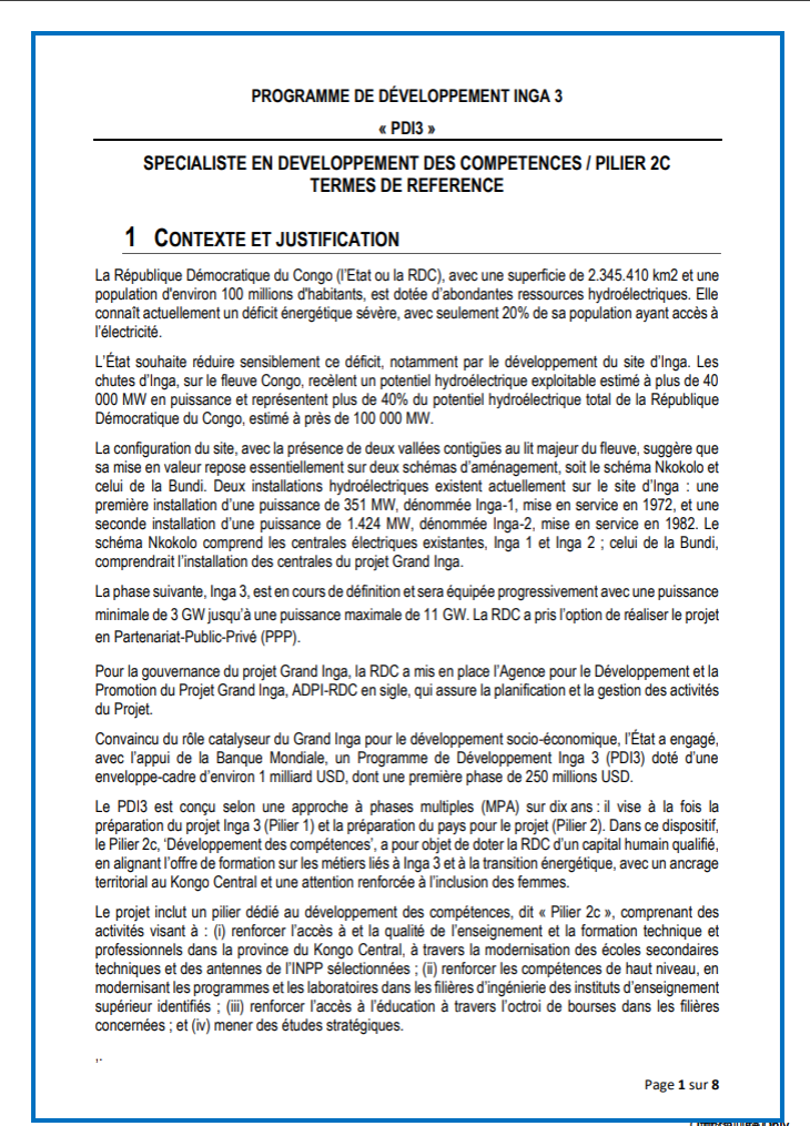 RECRUTEMENT D’UN CONSULTANT INDIVIDUEL SPECIALISTE EN DEVELOPPEMENT DES COMPETENCES / PILIER 2C POUR L’AGENCE POUR LE DEVELOPPEMENT ET LA PROMOTION DU PROJET GRAND INGA (ADPI-PDI3)