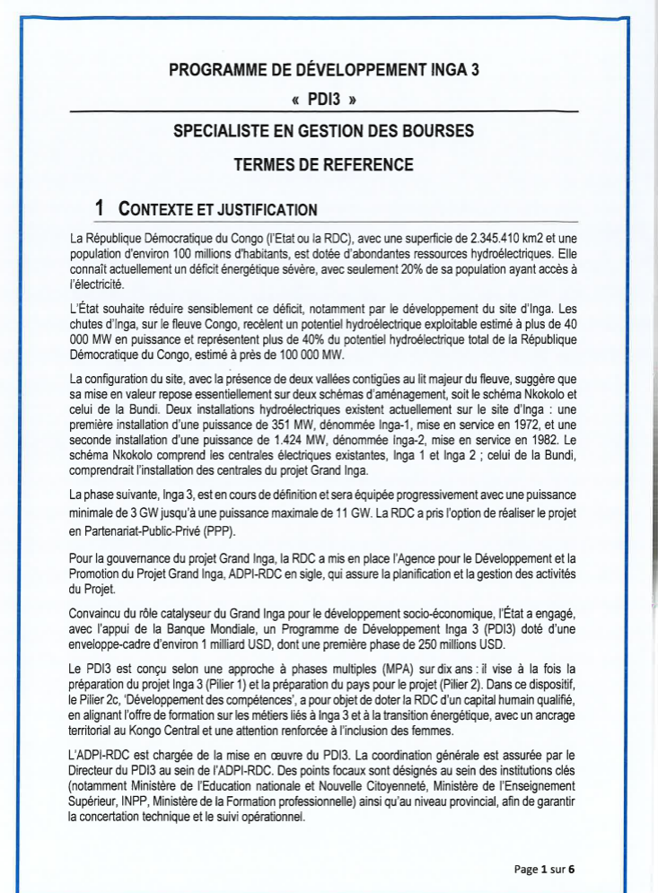 RECRUTEMENT D’UN CONSULTANT INDIVIDUEL SPECIALISTE EN GESTION DES BOURSES POUR L’AGENCE POUR LE DEVELOPPEMENT ET LA PROMOTION DU PROJET GRAND INGA (ADPI-PDI3)